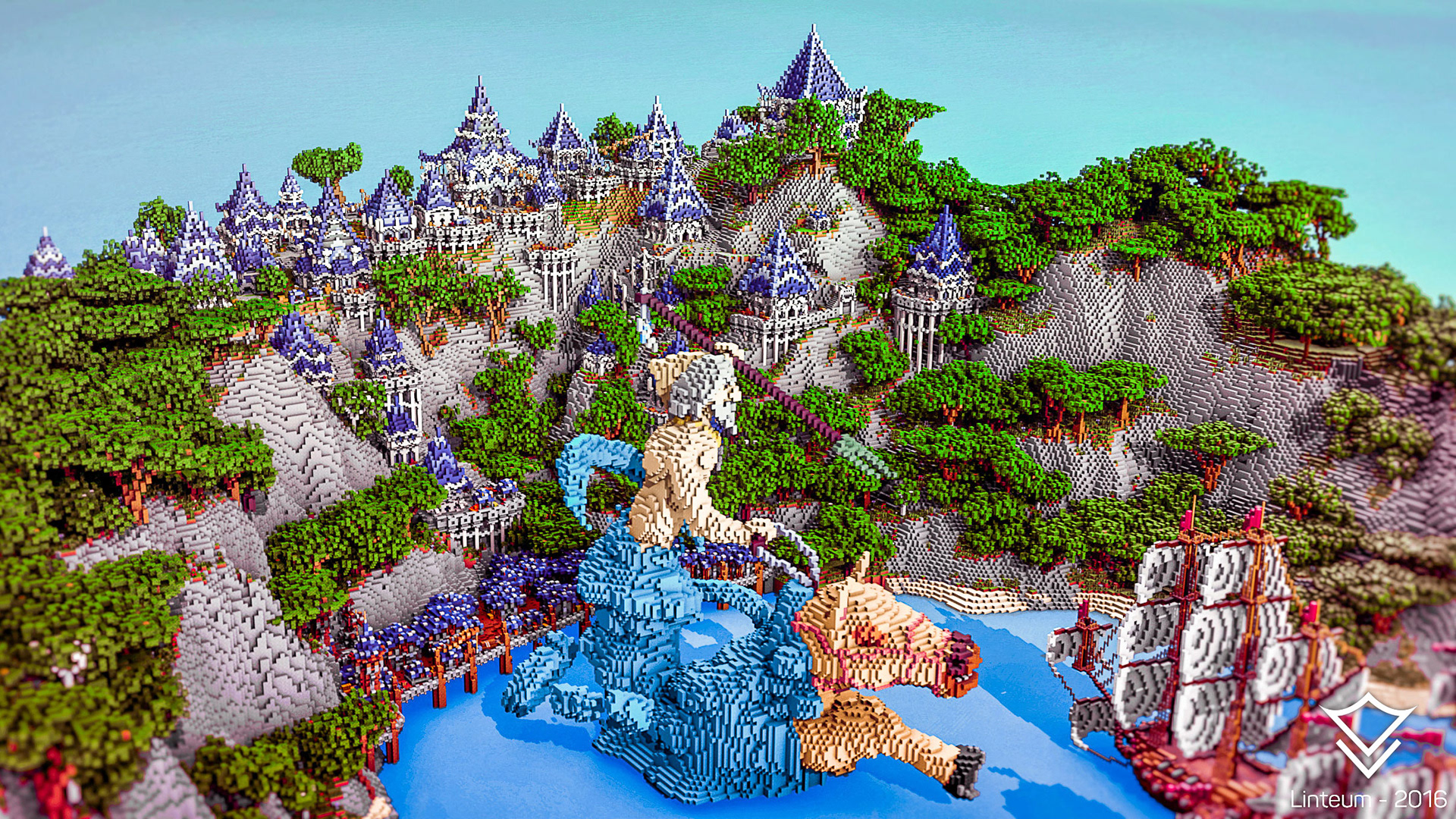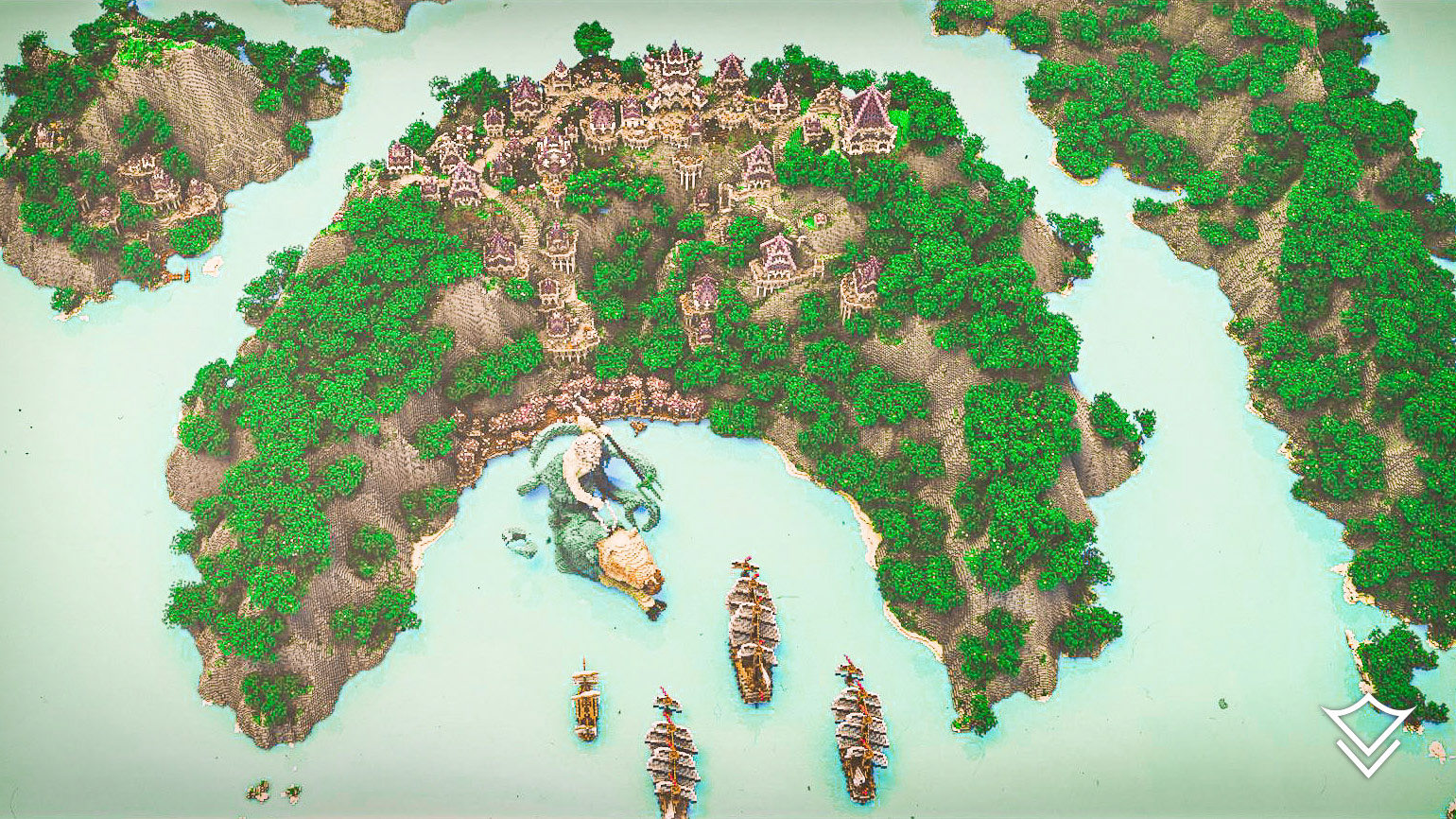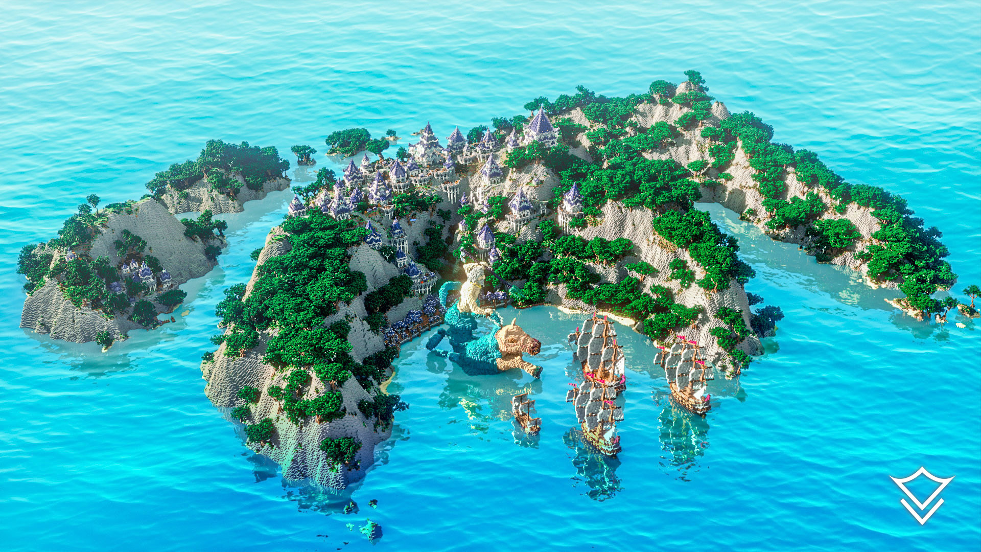Poseidon created these three crescent-shaped islands for his people to live on them. They built a town, established jobs, and fostered a commendable trade business through their large central port. One day, enemy ships appeared on the horizon. They were seeking to attack the islands and take control of key trade routes by controlling the port. As peaceful people, the islands' citizens feared that nothing would save them, but as the ships neared, Poseidon rose out of the water, riding on his hippocampus—ready to defend his people. In this project, Poseidon is pictured seconds before sinking the enemy ships.