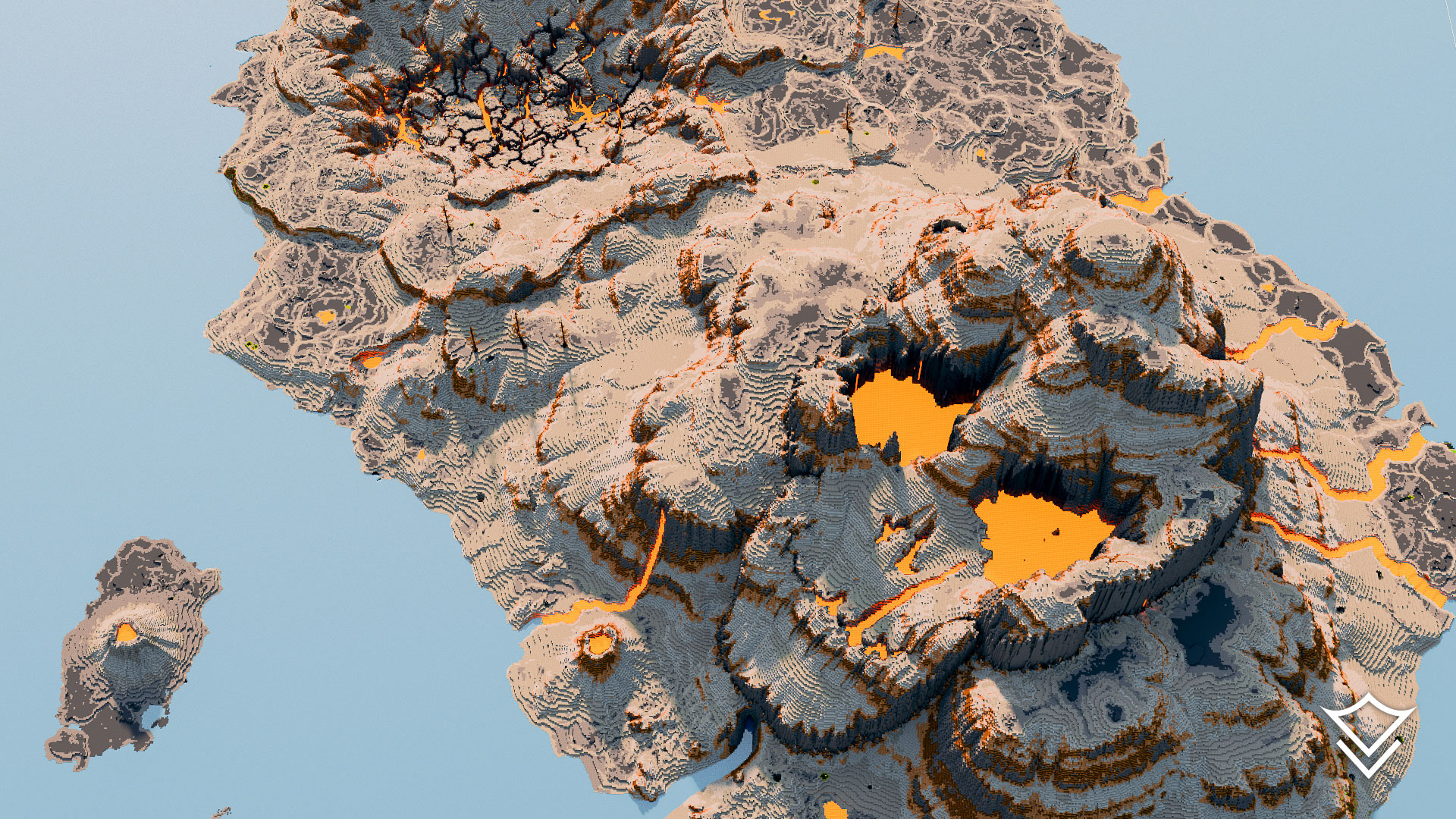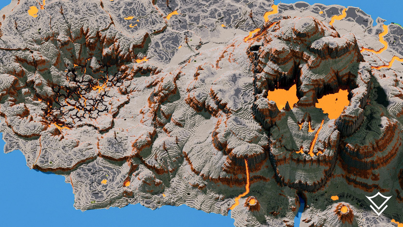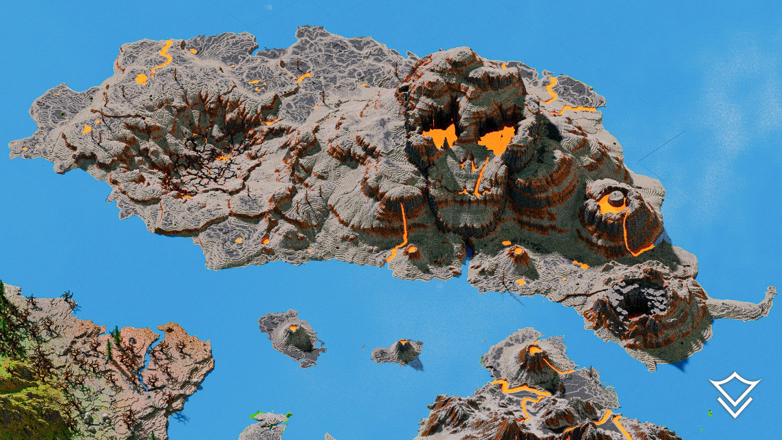 Additional landmarks include a massive river boulder, a collapsed volcanic crater (caldera), and eroded terrain arches. Every detail of this map has been meticulously designed for an immersive Minecraft adventure.