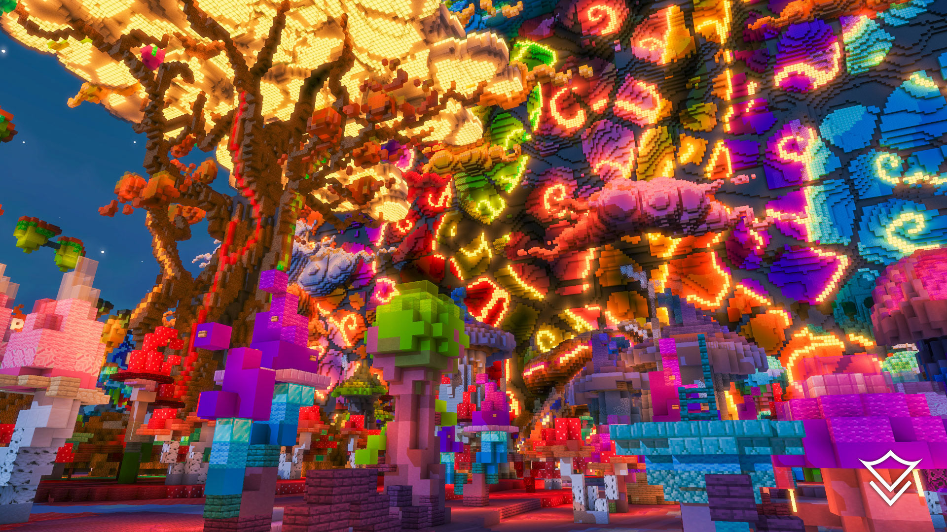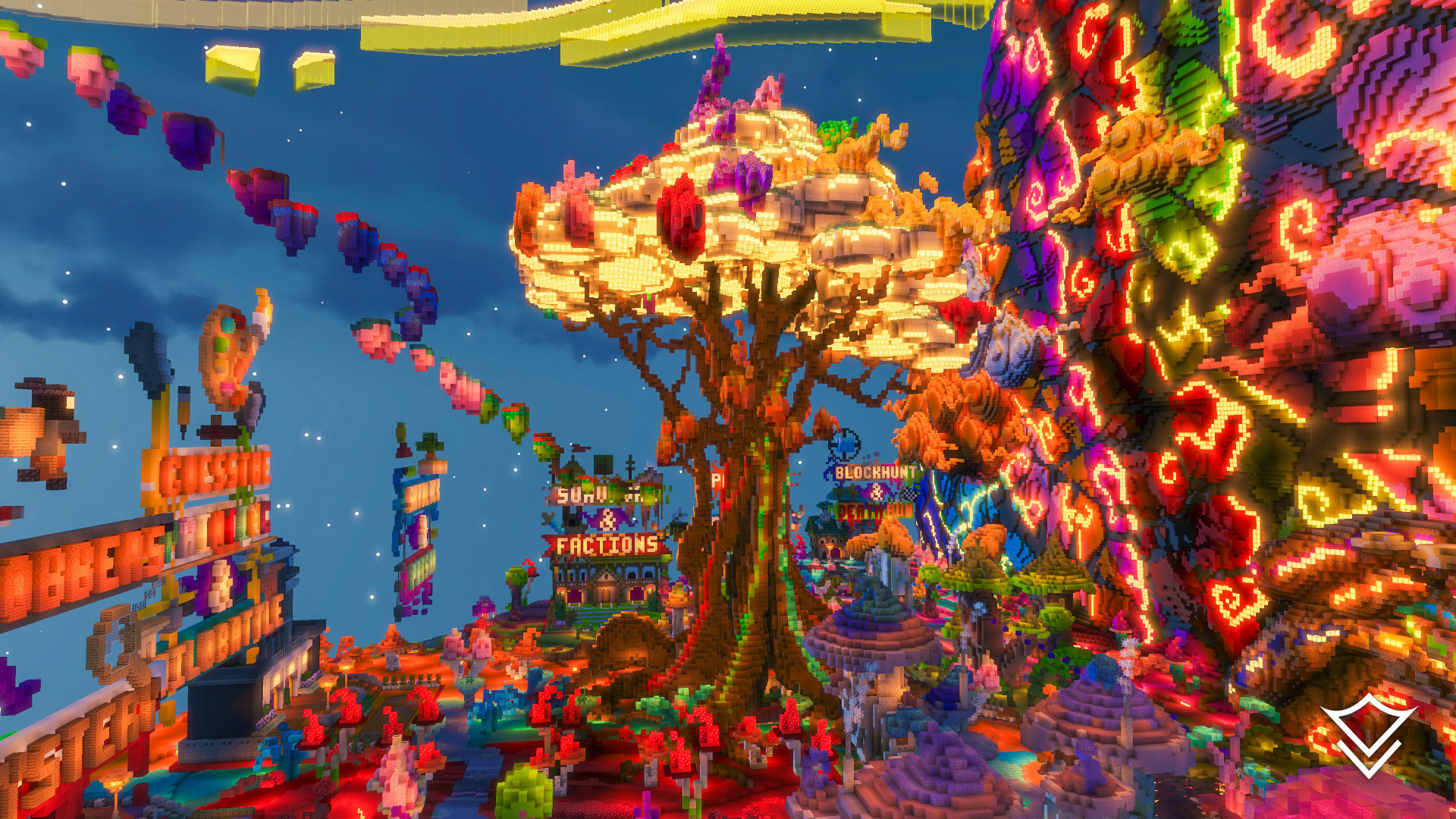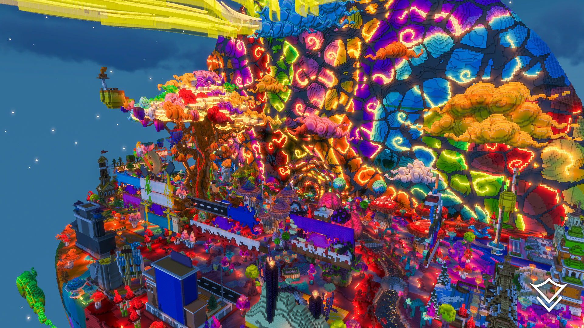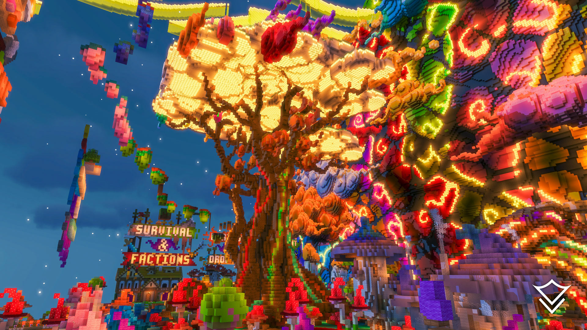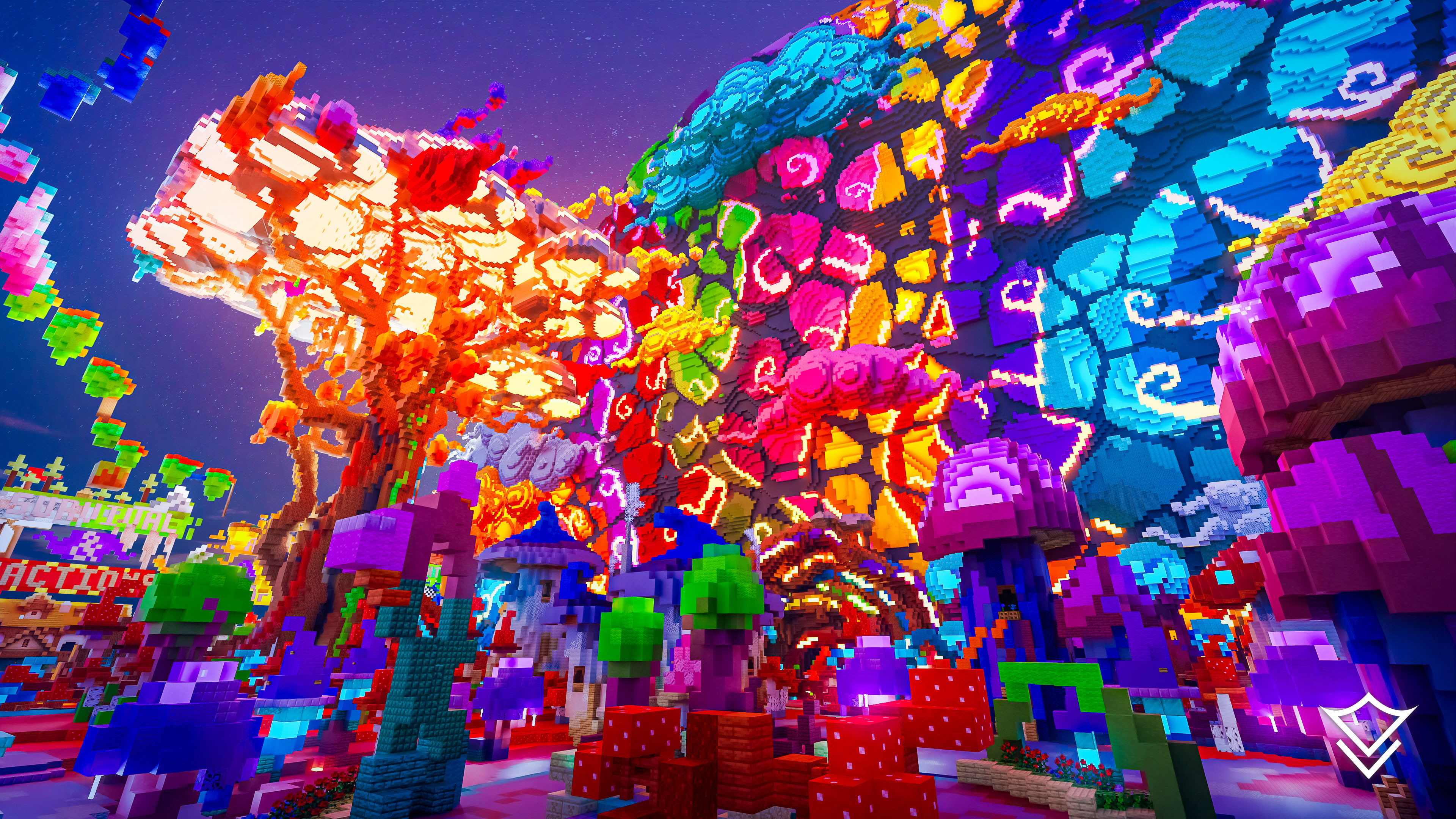 Dive into the vivid realm of Nova Nexus, a psychedelic Minecraft hub designed for a large Minecraft network. This mesmerizing 3D globe, bursting with neon colors, is centered around a majestic tree. Glowing veins of light emanate from its roots, weaving through the terrain and feeding into an enchanting, brightly illuminated canopy.