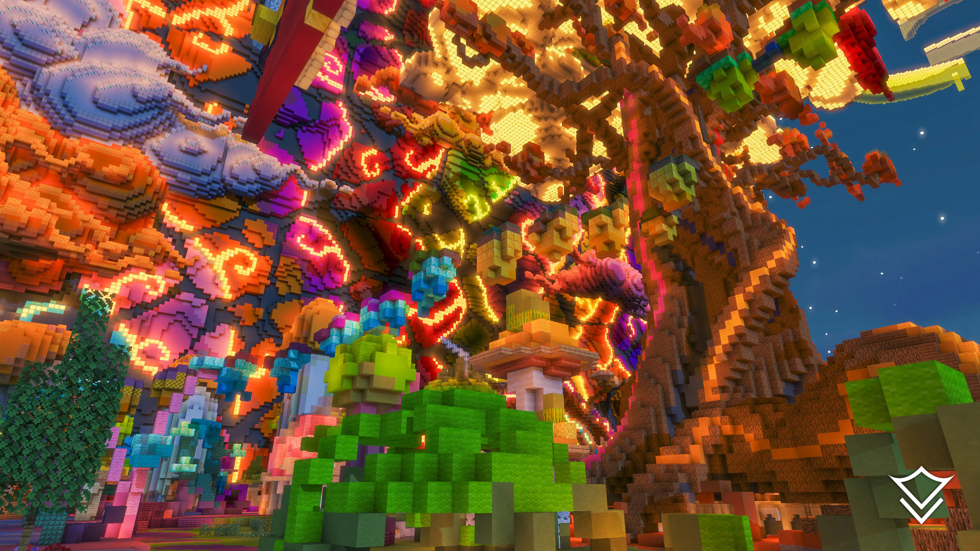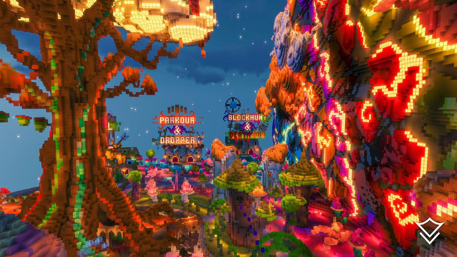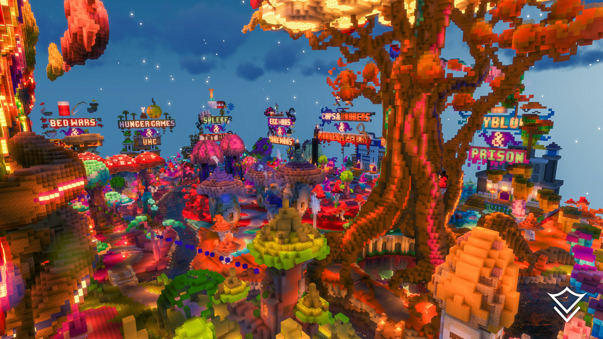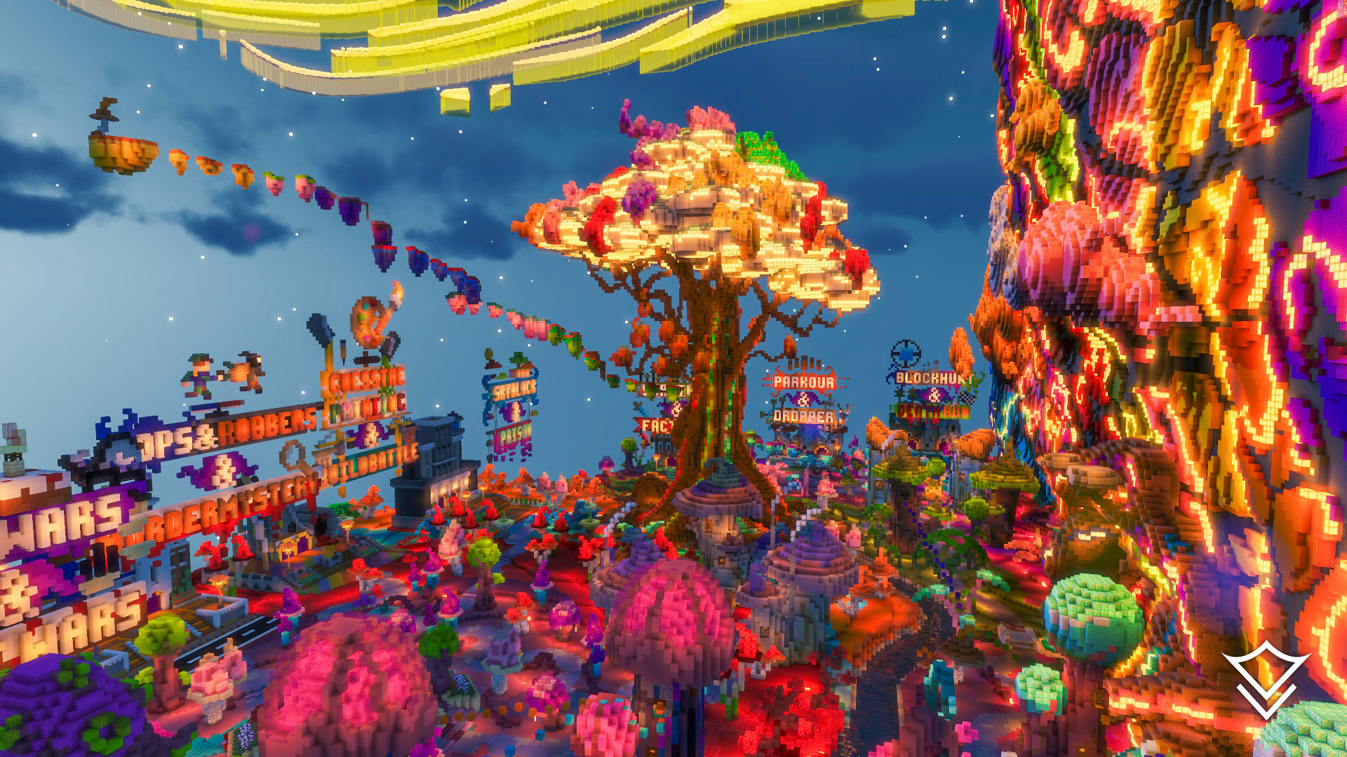 Dive into the vivid realm of Nova Nexus, a psychedelic Minecraft hub designed for a large Minecraft network. This mesmerizing 3D globe, bursting with neon colors, is centered around a majestic tree. Glowing veins of light emanate from its roots, weaving through the terrain and feeding into an enchanting, brightly illuminated canopy.