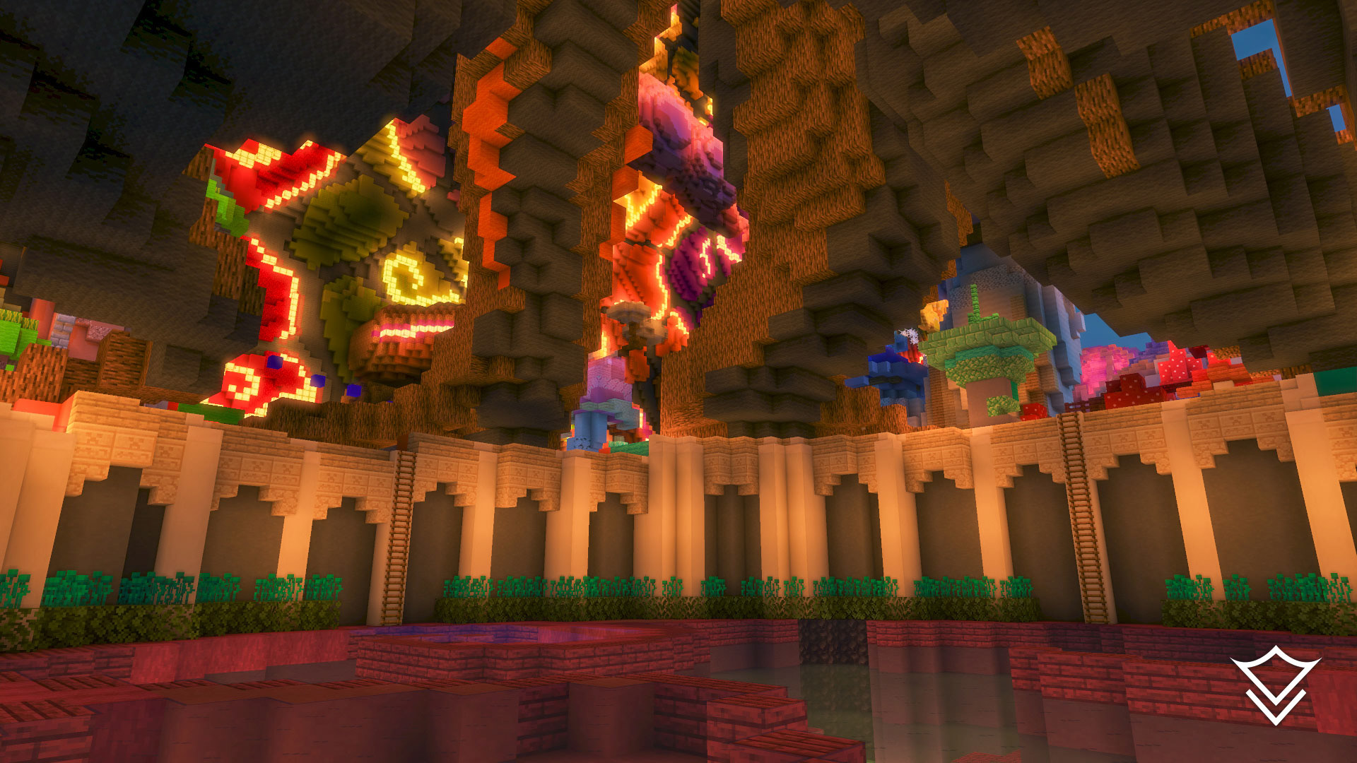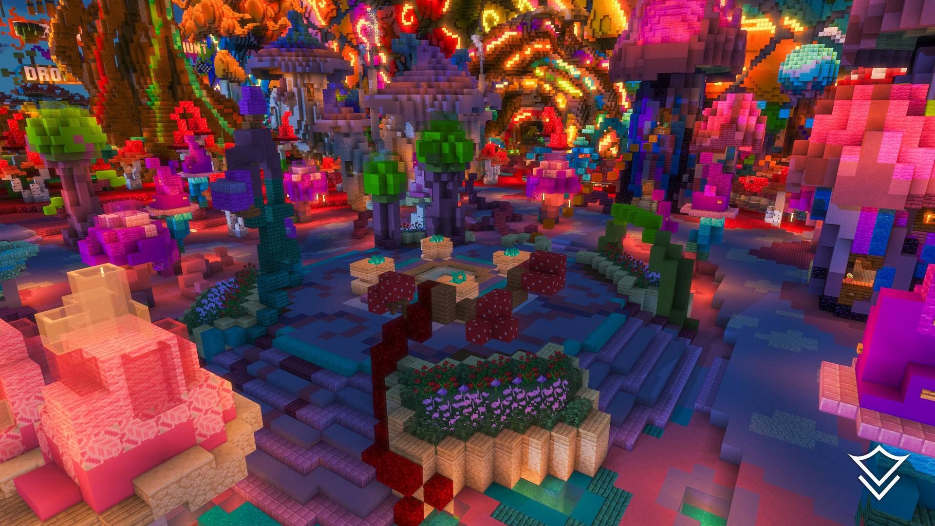 Amidst the psychedelic landscape, there are charming mushroom houses with full interiors. Beneath the central tree's roots lies a PVP pit for exhilarating battles. Look to the sky above the spawn, and witness the ethereal dance of green northern lights streaking across the canvas.