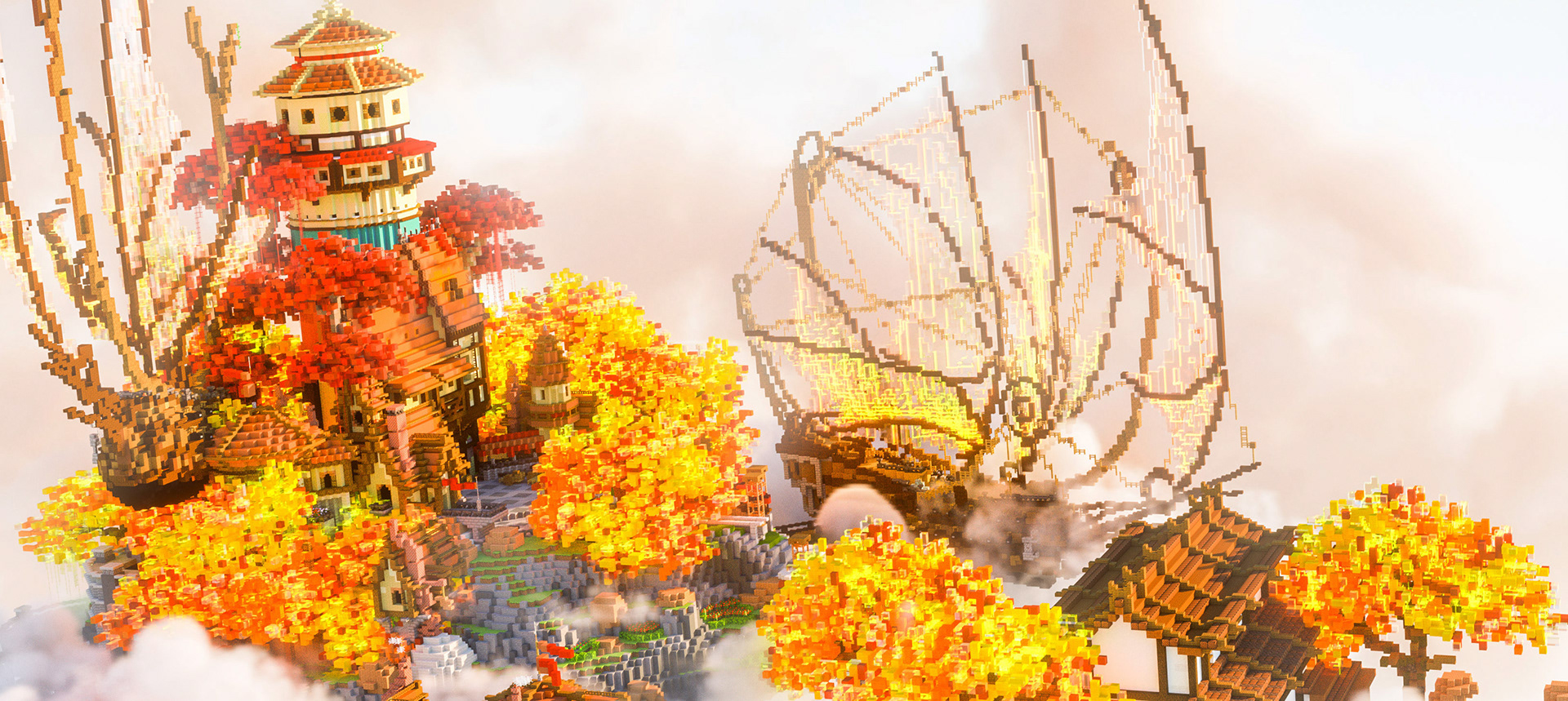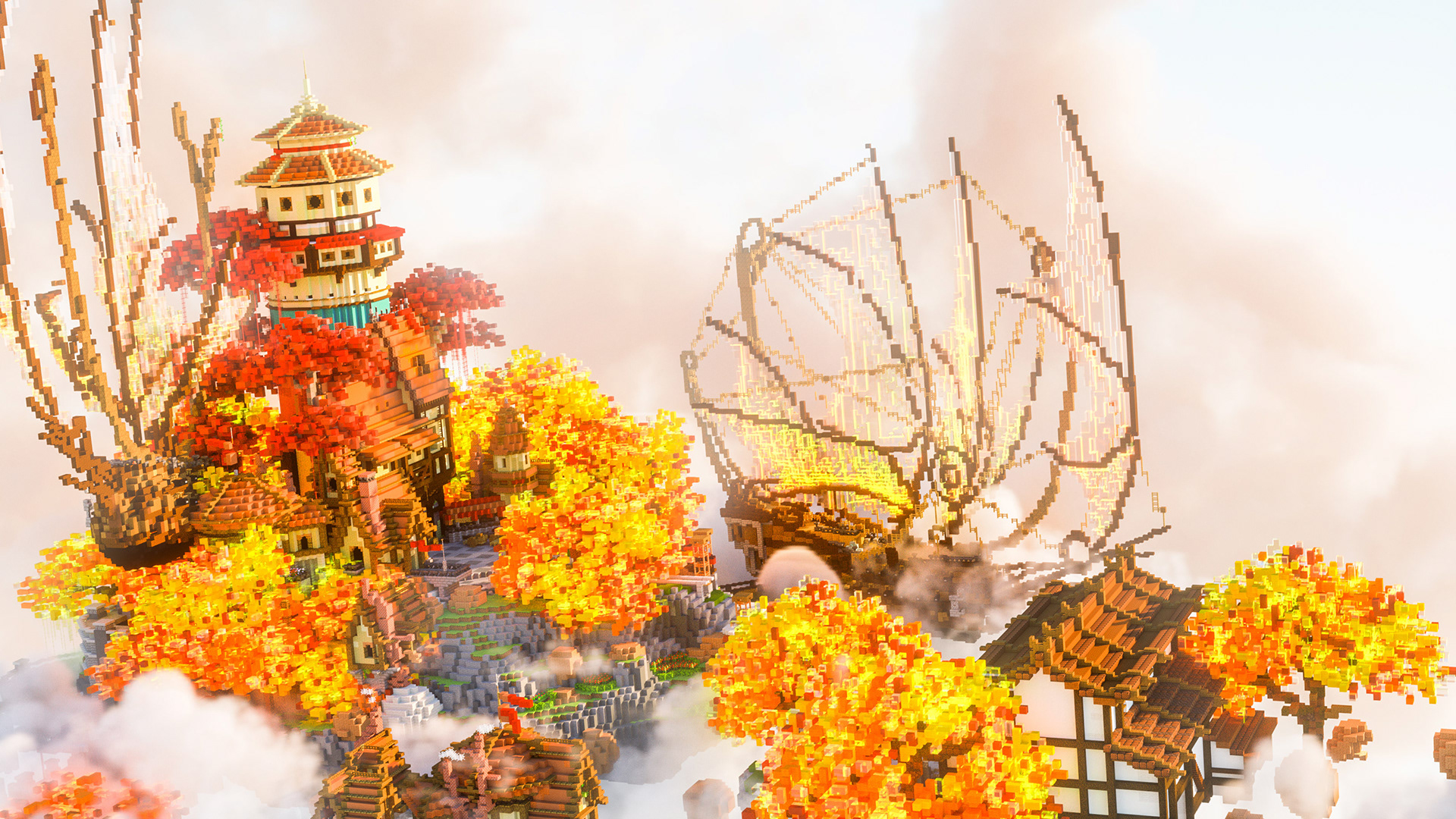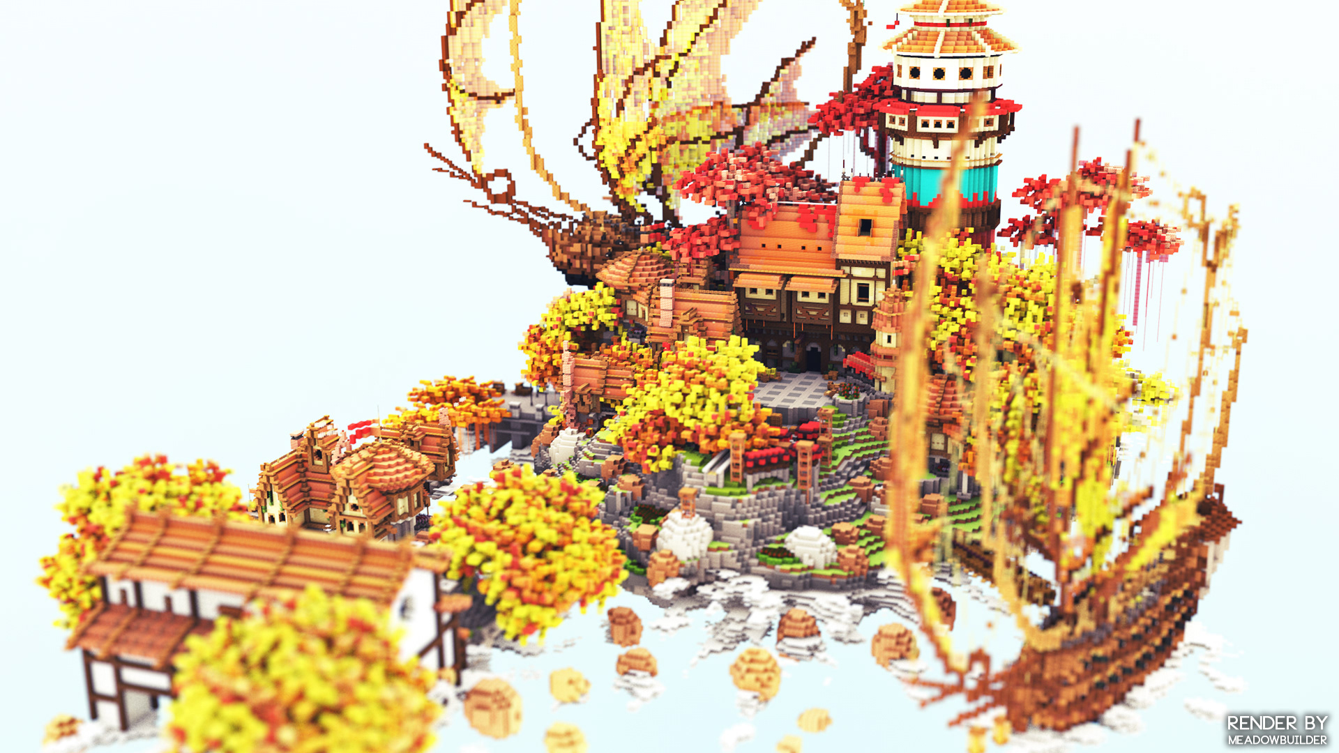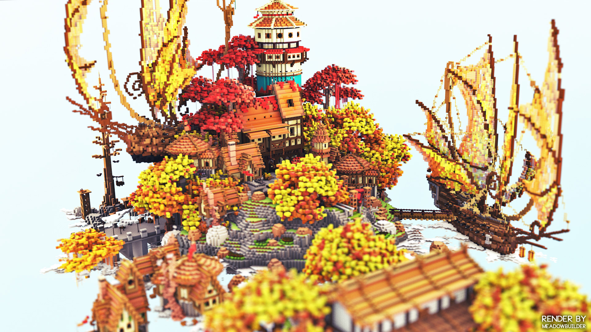 Varuna is proud to present Sky Ships, a stunning spawn built for a popular Minecraft server network. This project took one week to complete and features its most iconic element – diagonal ships floating through clouds and docking on the levitating island's ports.