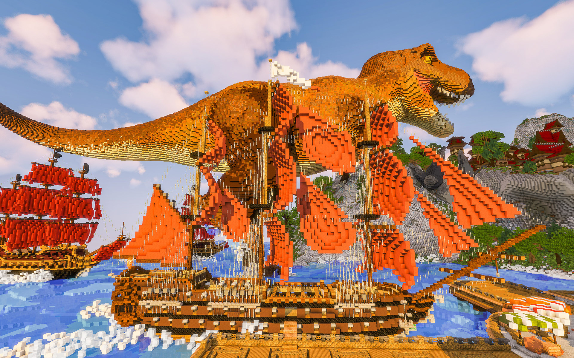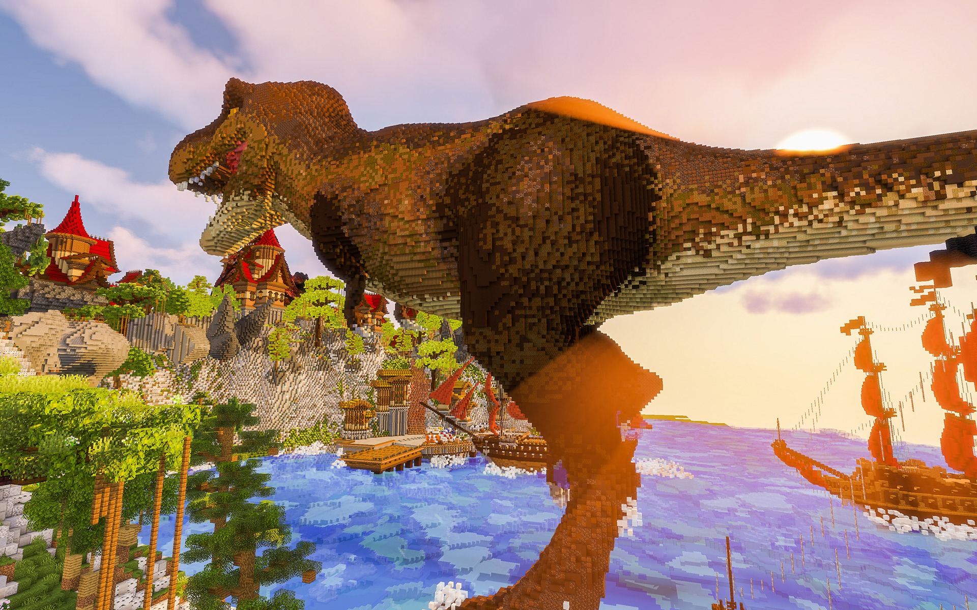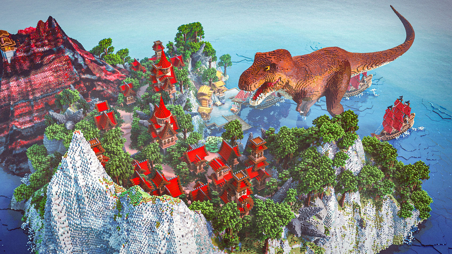 Varuna is excited to introduce you to The Island of Vigrid, a place where epic battles are fought. Vigrid means "battle-surge" or "place where battle surges" in Old Norse, and we've brought this concept to life with a thrilling conflict between the citizens of Vigrid, a charging t-rex, and three pirate ships.